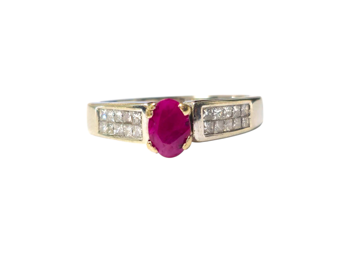 Metal: 14k white gold. Center: 1CT ruby, oval shape. Side diamonds: 0.75CWT, SI1 clarity, G color. All stones are 100%...