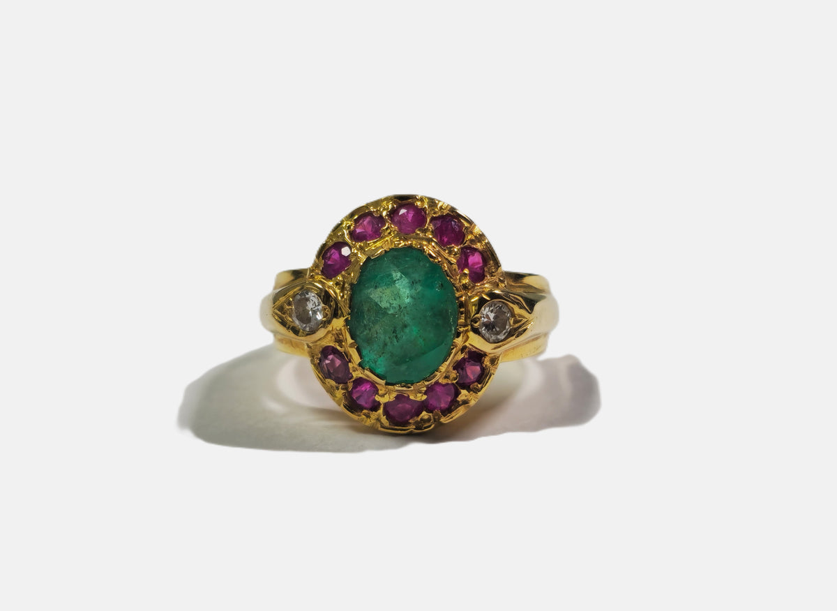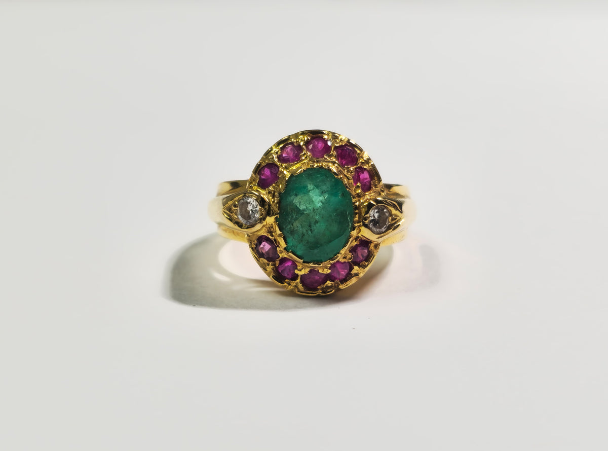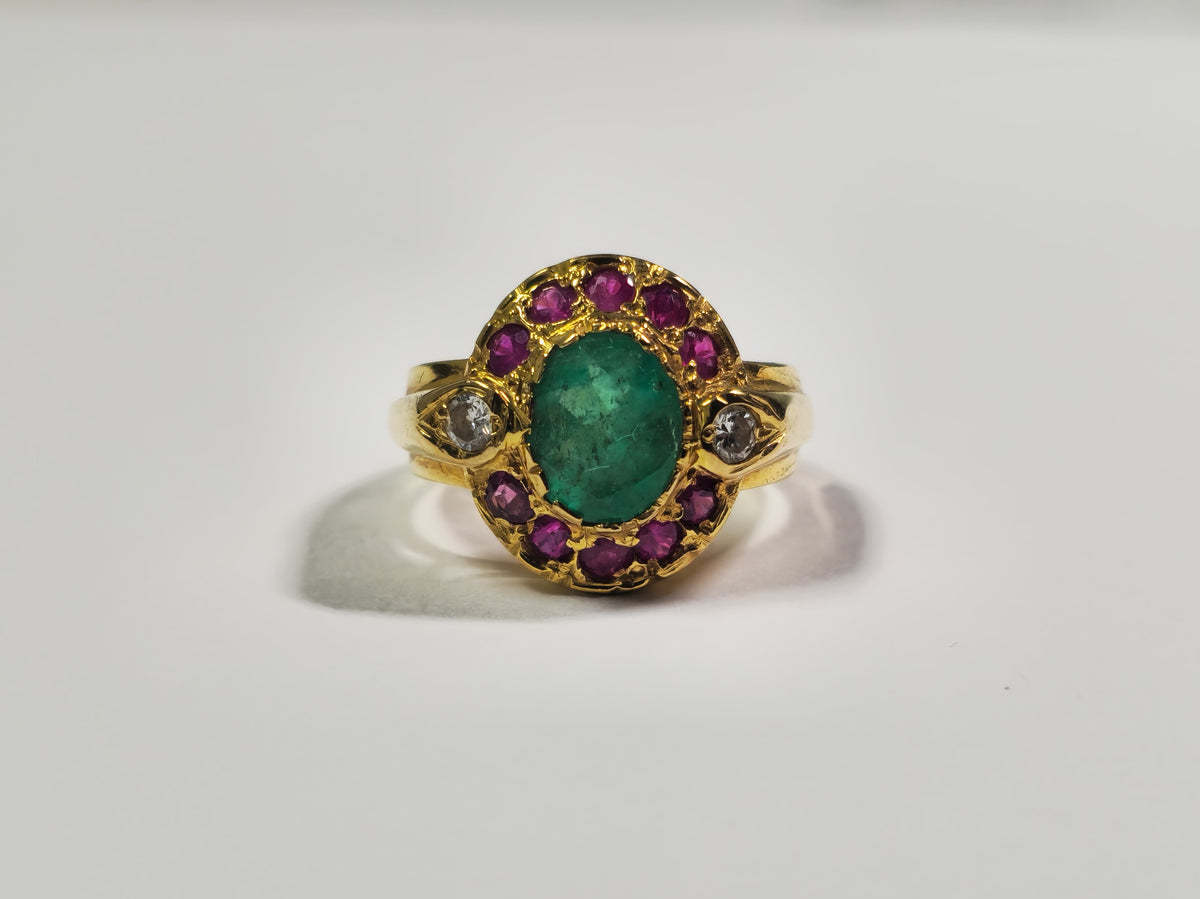 2.4ct Emerald, Ruby and Diamond Ring in 18k Gold