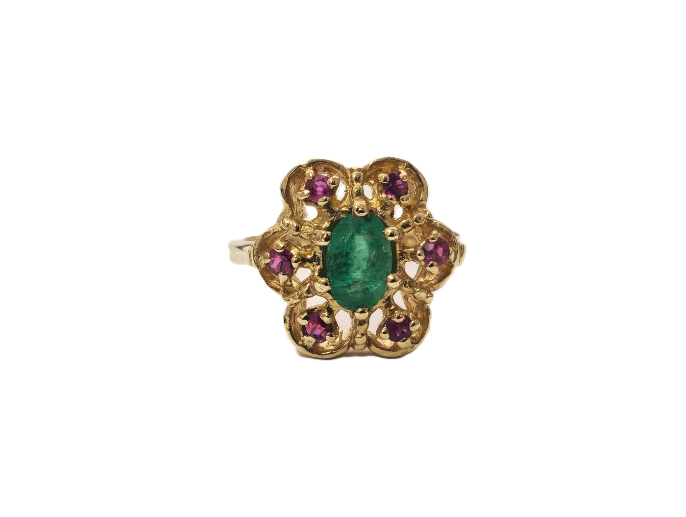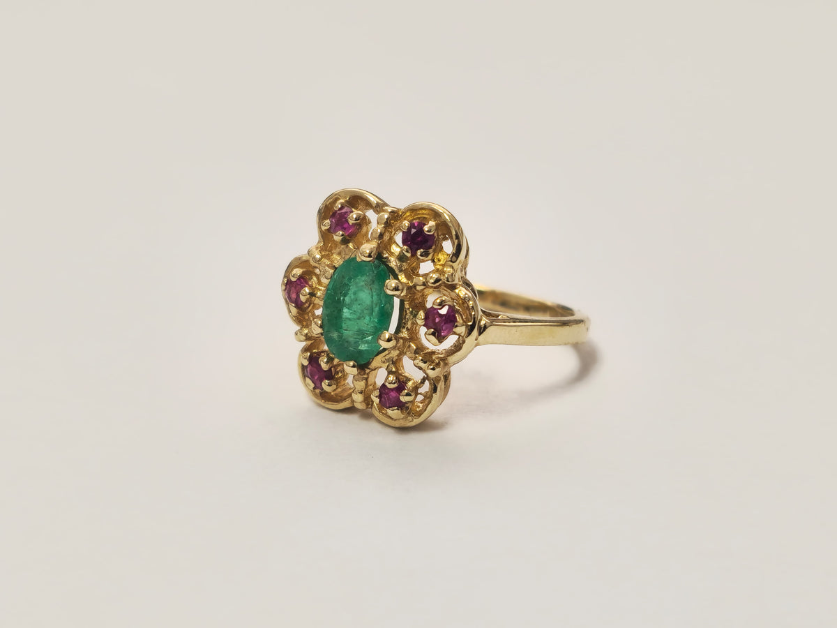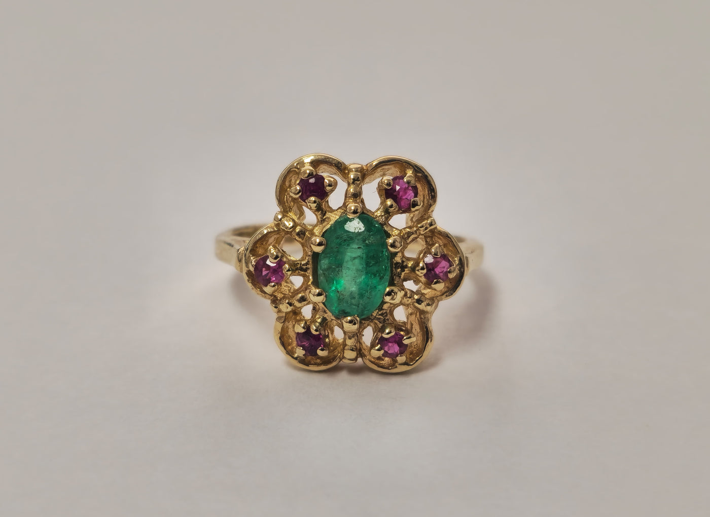 Elegant 14K Gold Ladies Ring with Ruby and Emerald