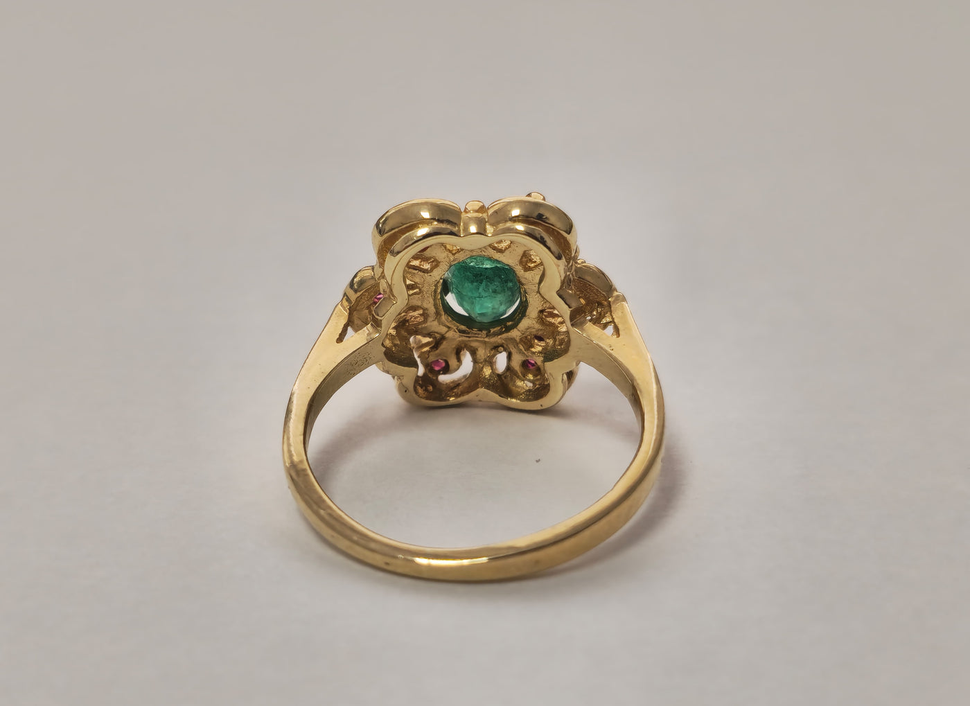 Introducing a captivating 14kt gold ring resizable for a perfect fit. 0.60ct emerald. 0.40ct Ruby. Total 1ct. 14kt gold. 3.6...