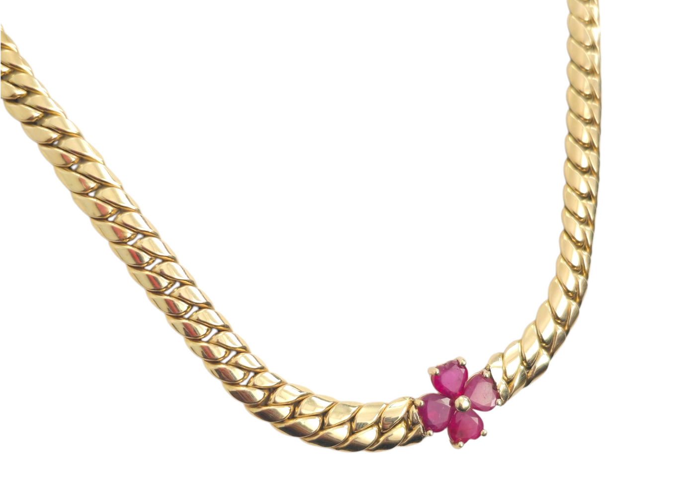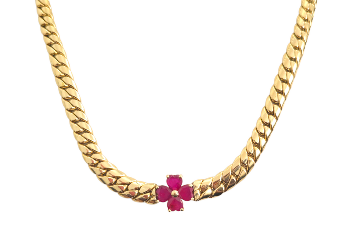Petal Motif Ruby & Gold Cuban Chain in 14k Gold