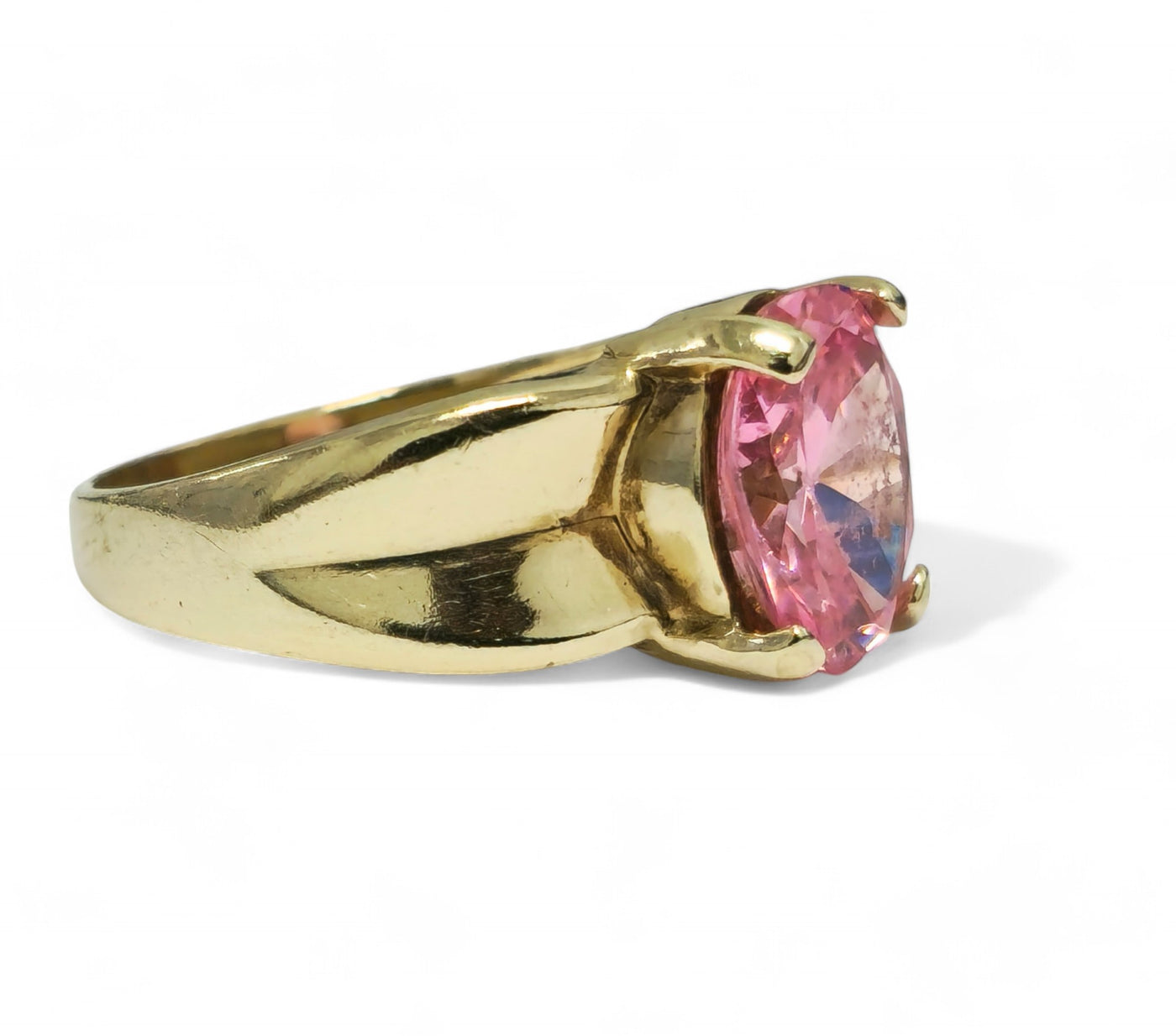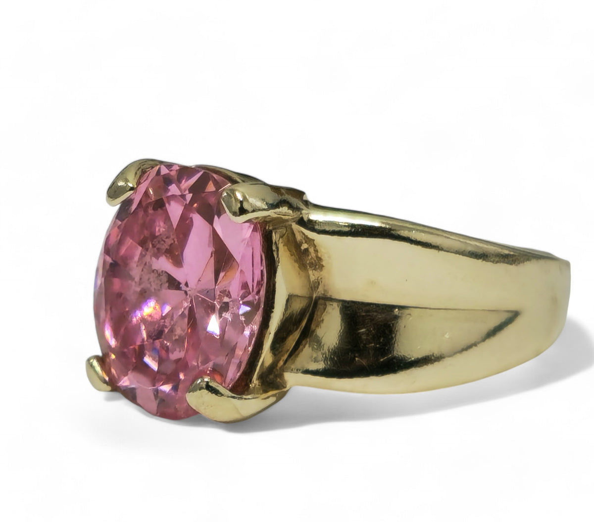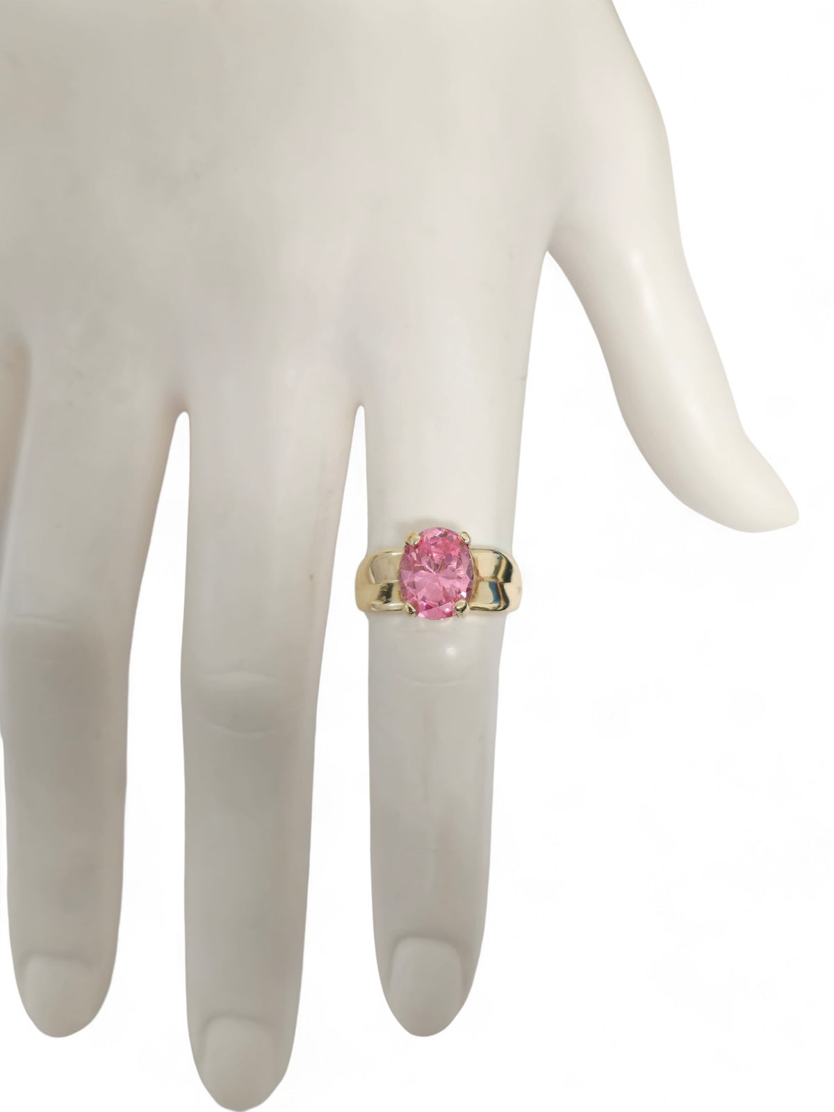 Stunning 10k gold ring featuring a 2.7ct pink topaz center stone. Pink topaz center. 2.7ct. 3.3 grams. Ring Size: US...
