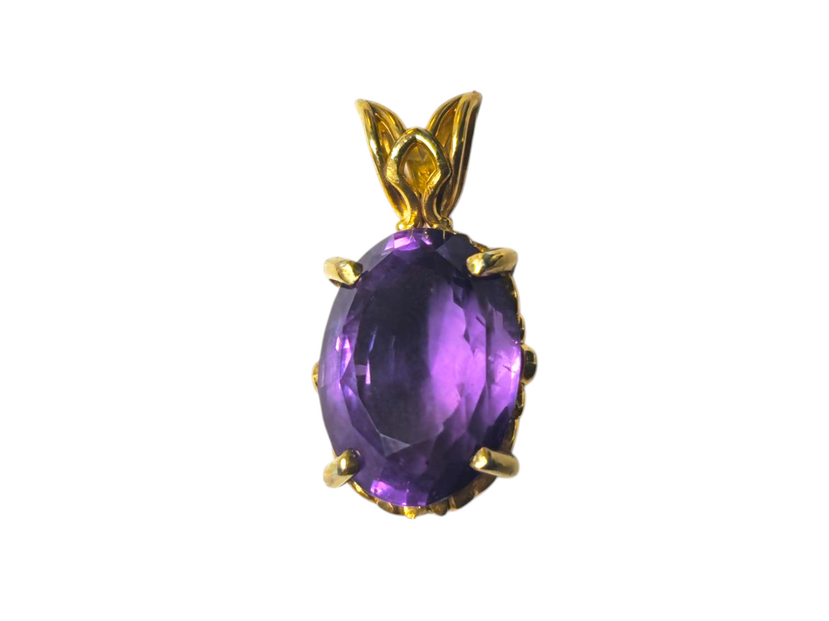 Metal: 14k yellow gold. Center: 7 carat Amethyst, oval shape. 100% natural earth mined. 2.3 inches long. Vintage gemstone pendant...