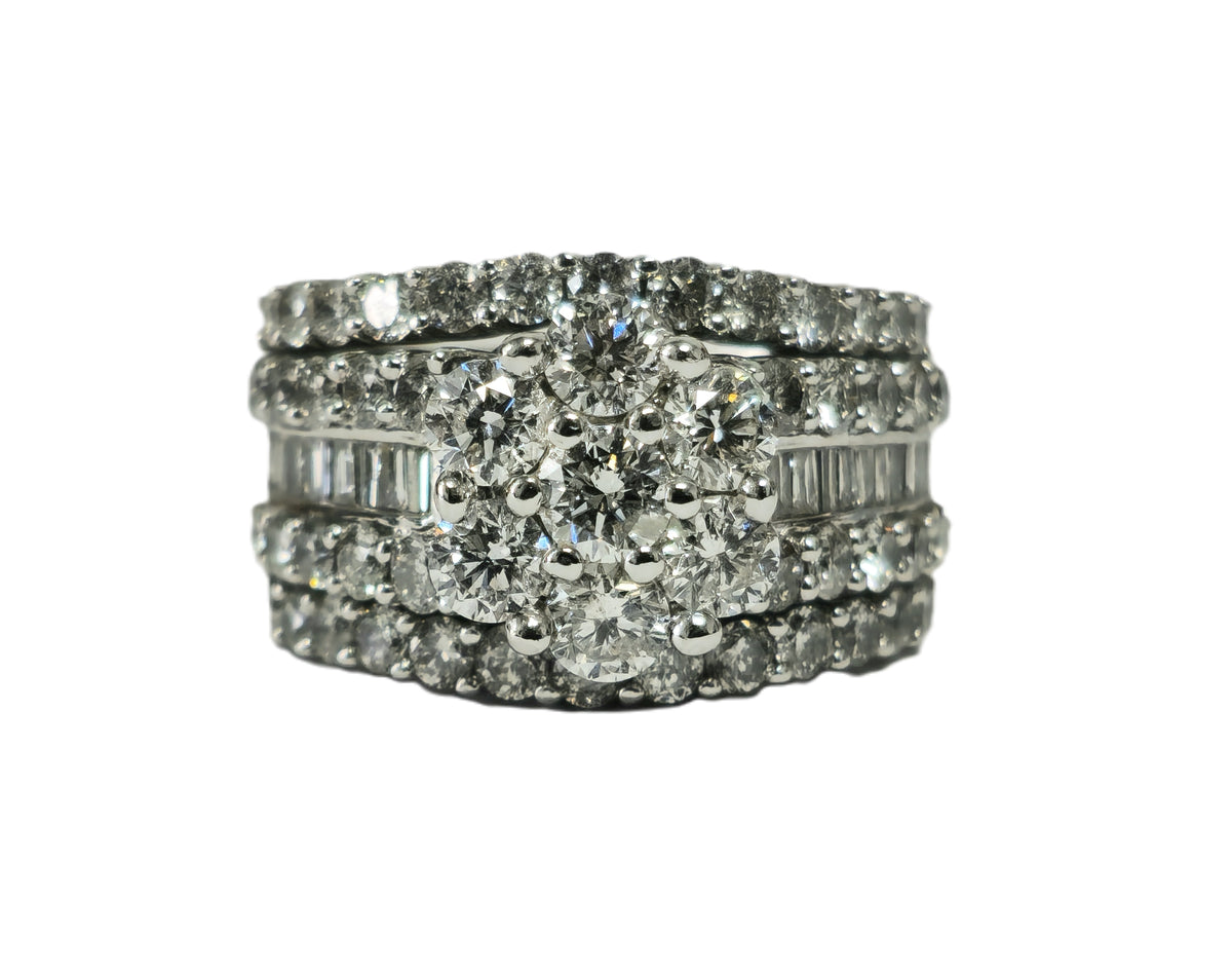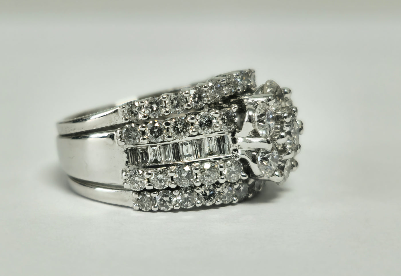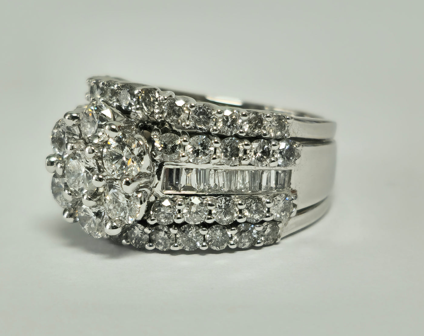 Gorgeous gold and diamond ring for ladies. Beautiful floral design. Solid 14k white gold. TCW of all diamonds: 3.75cts. Round brilliant...