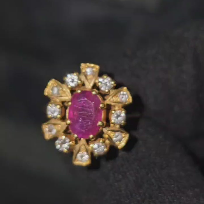 Antique ruby and diamond cocktail ring for her. 100% natural earth mined. Metal: 18k yellow gold. Center stone: 1.30 carat ruby....
