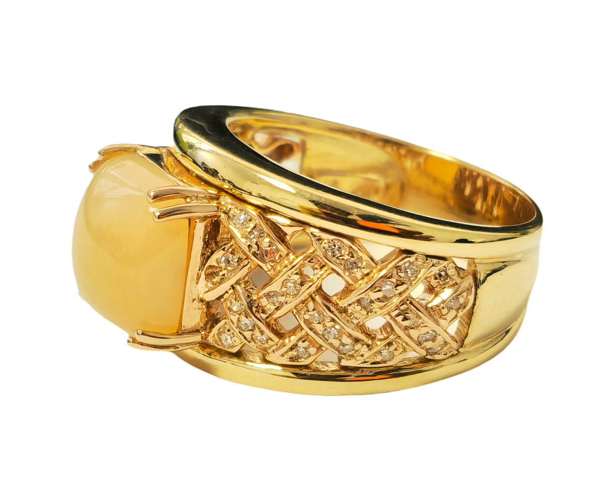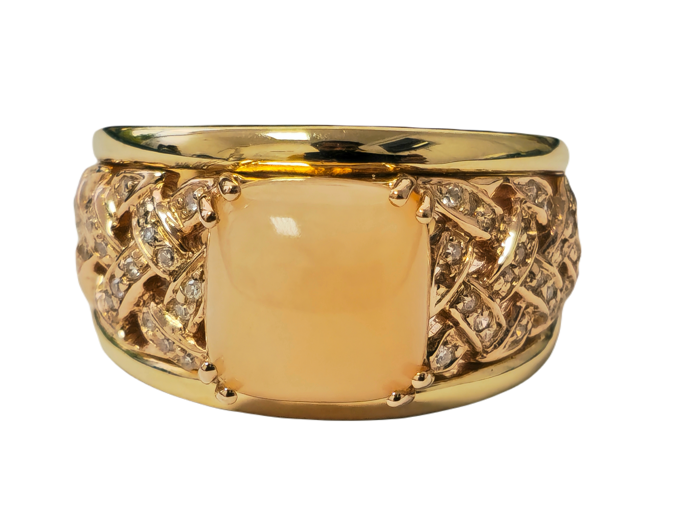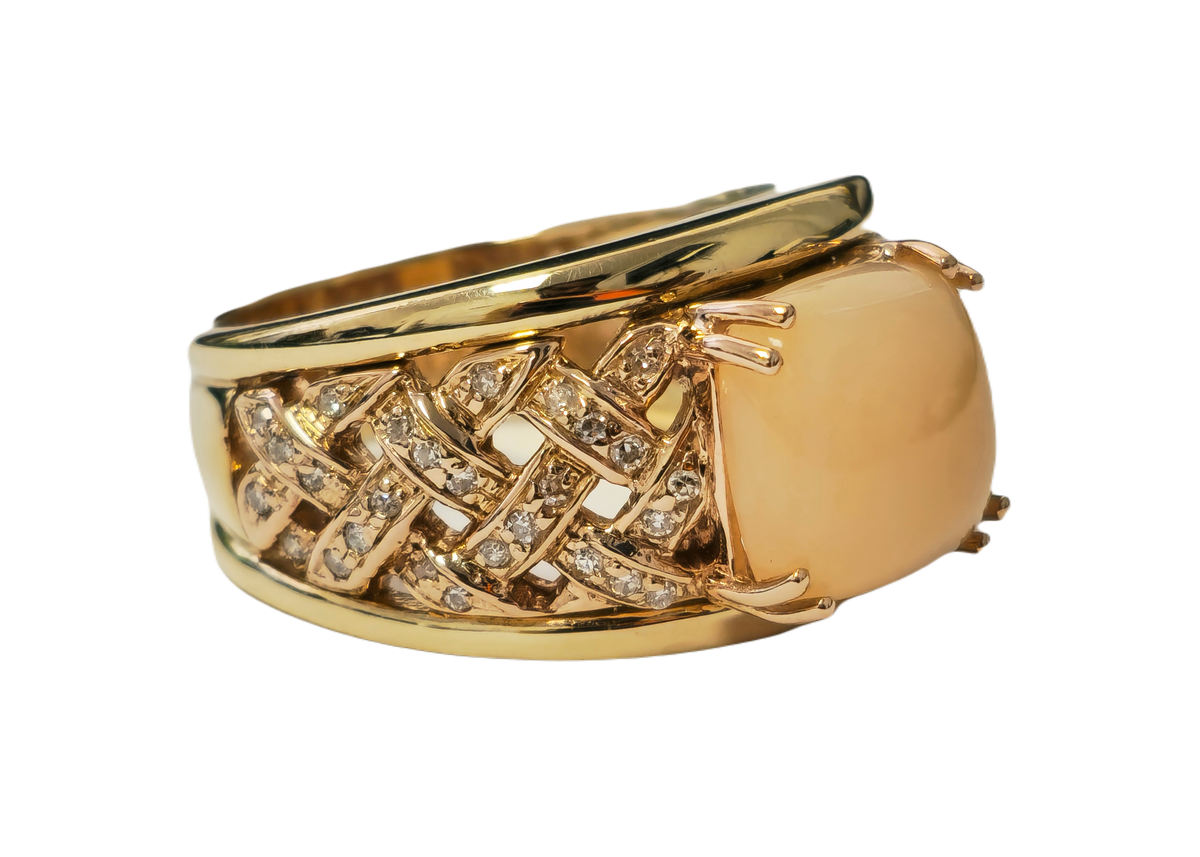 Beautiful modern style womens pink opal ring. Great color and saturation Metal: 14k yellow gold. Center stone: Pink opal. 5.70 carat....