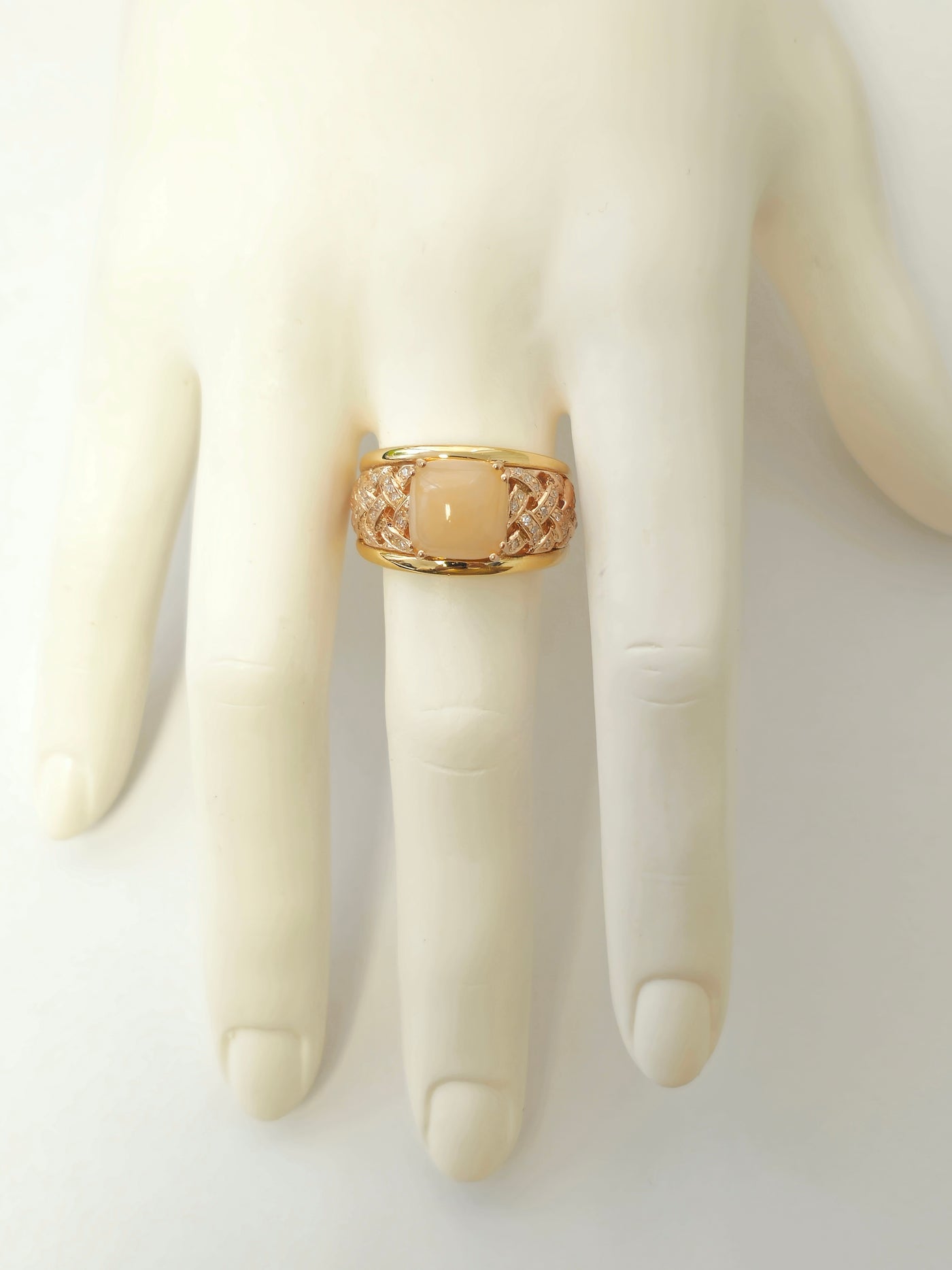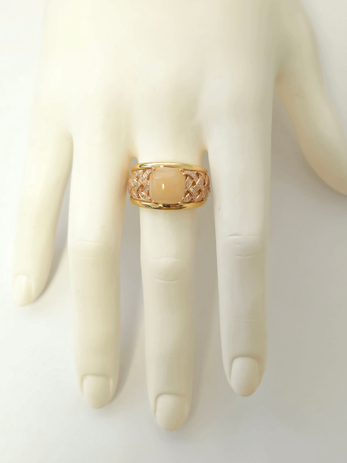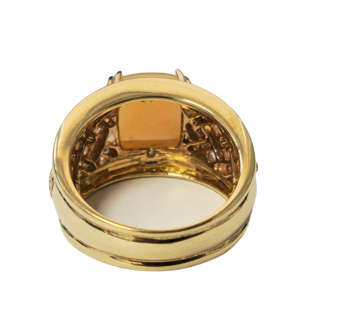 Beautiful modern style womens pink opal ring. Great color and saturation Metal: 14k yellow gold. Center stone: Pink opal. 5.70 carat....