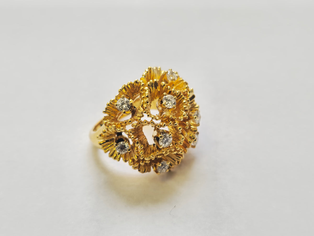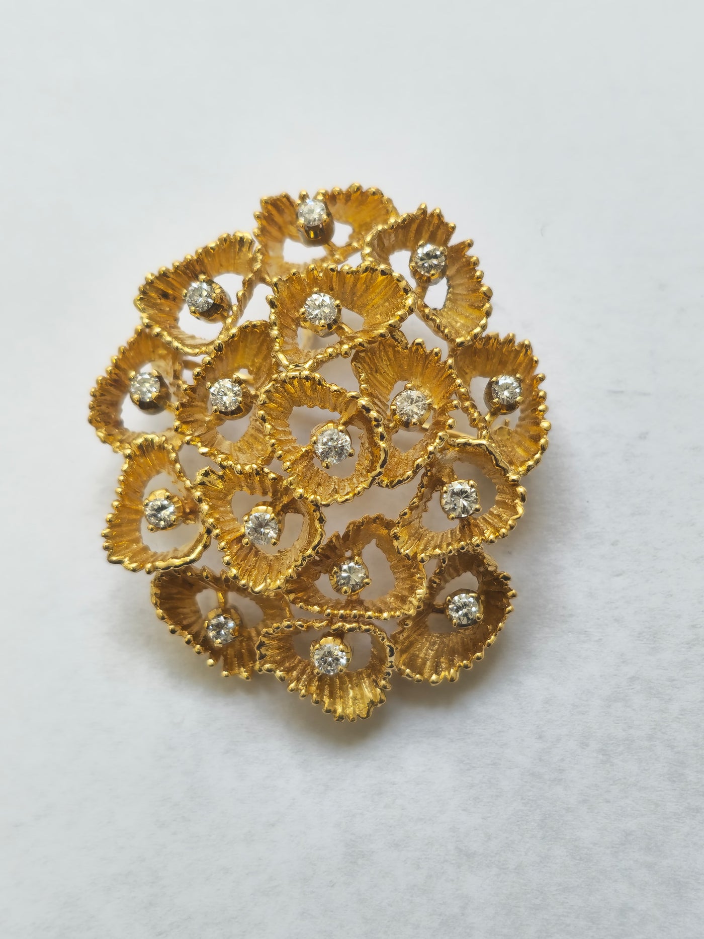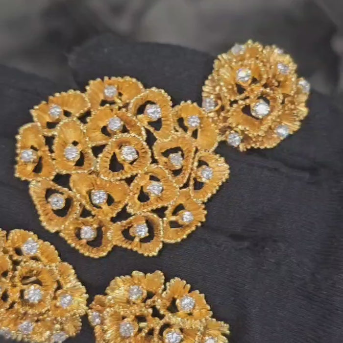 Full Set: Ring, Earrings and Pin radiating elegance and sophistication. 18k gold. Ring: 15.5g 5.50 US. 0.80ct total. Earrings: 25.8g....