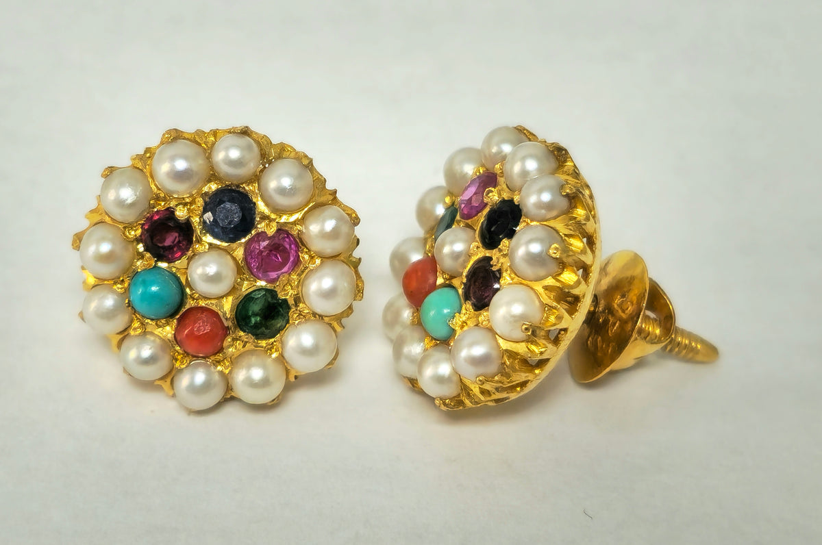 Vintage 22k Yellow Gold Pearl, Emerald and Sapphire Earrings