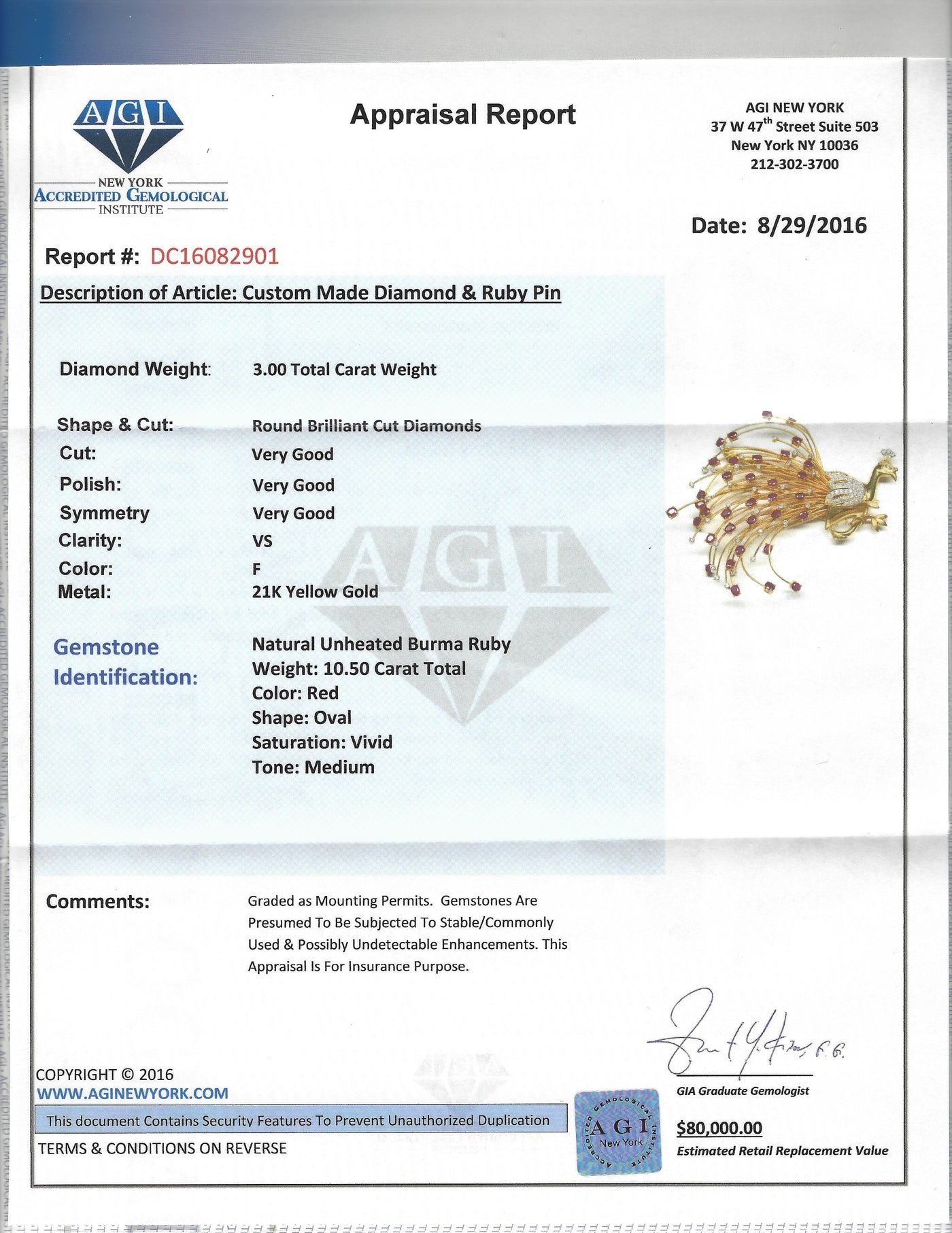 13.50ct Burma Ruby and Diamond Peacock Pin. Gorgeous peacock pin. 21kt Yellow Gold, Ruby: Origin - Burma, 100% natural, 10.50cts,...