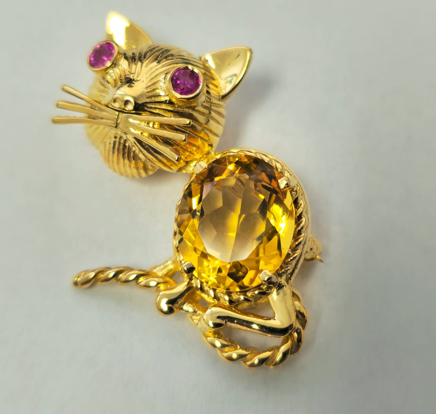 Vintage collectible cat motif pin for ladies. Metal: 14k yellow gold. Gemstones: 8.43 carat natural yellow citrine. Oval shape citrine....