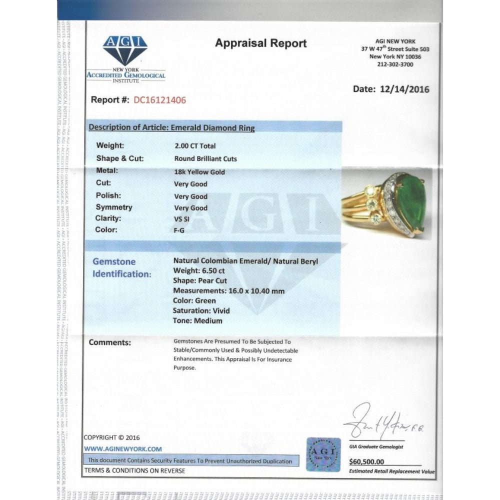18K Yellow Gold. 6.50 CT Natural Colombian Emerald. Pear Shape, Set in prongs. TCW of Diamonds: 2.00 cts. VS-SI clarity...