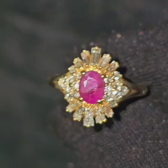 Beautiful ladies ruby and diamond ring. Excellent vintage style ring. Solid 14kt yellow gold. 1.00ct ruby, oval cut set in prongs....