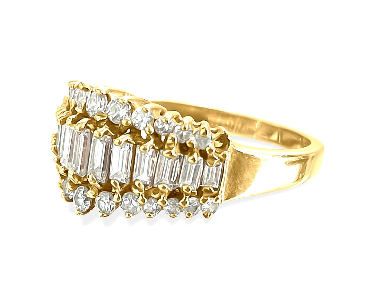 Round brilliant and baguette cut diamonds set in prongs. Metal: 14K yellow gold. Total carat weight of the diamonds: 1.00...