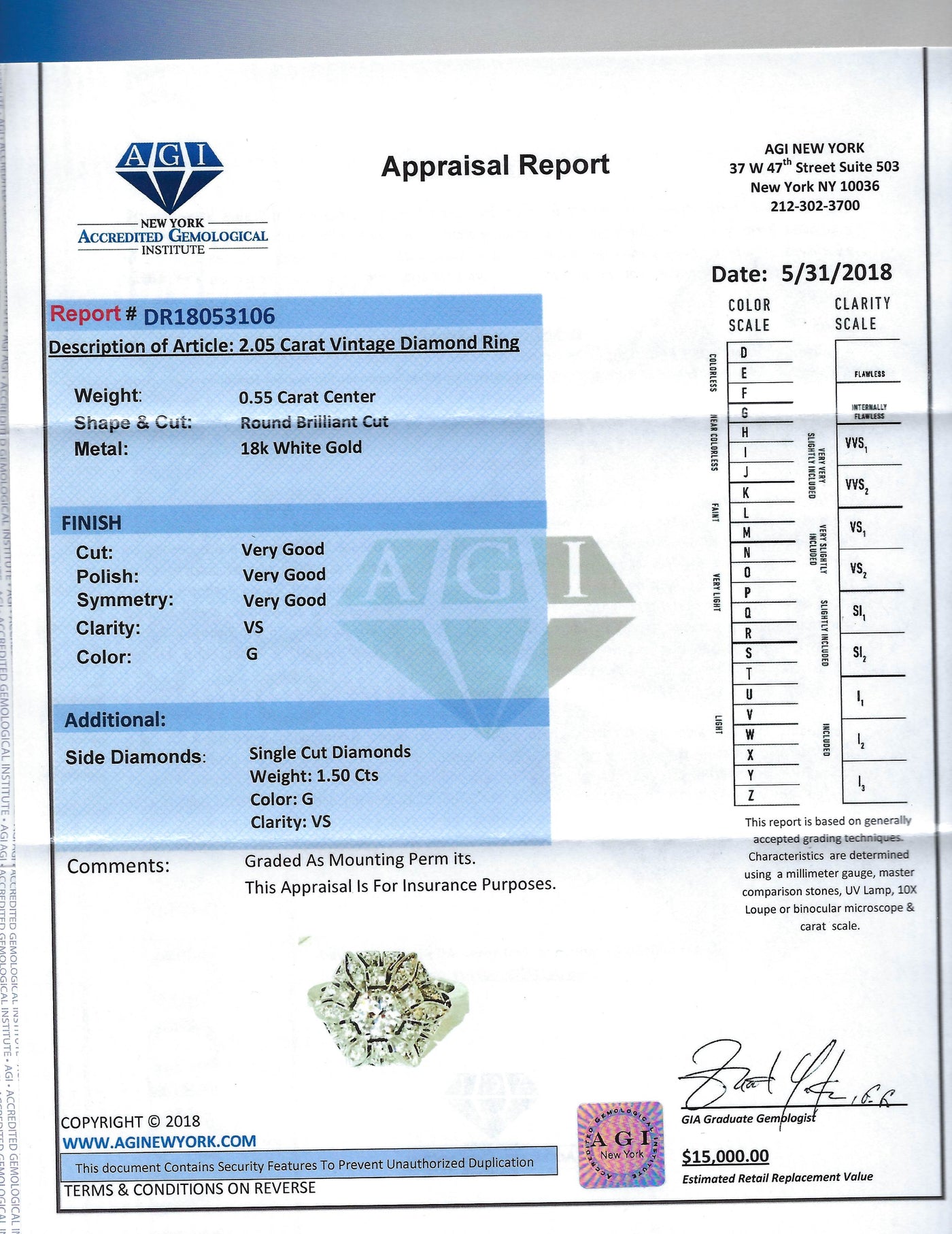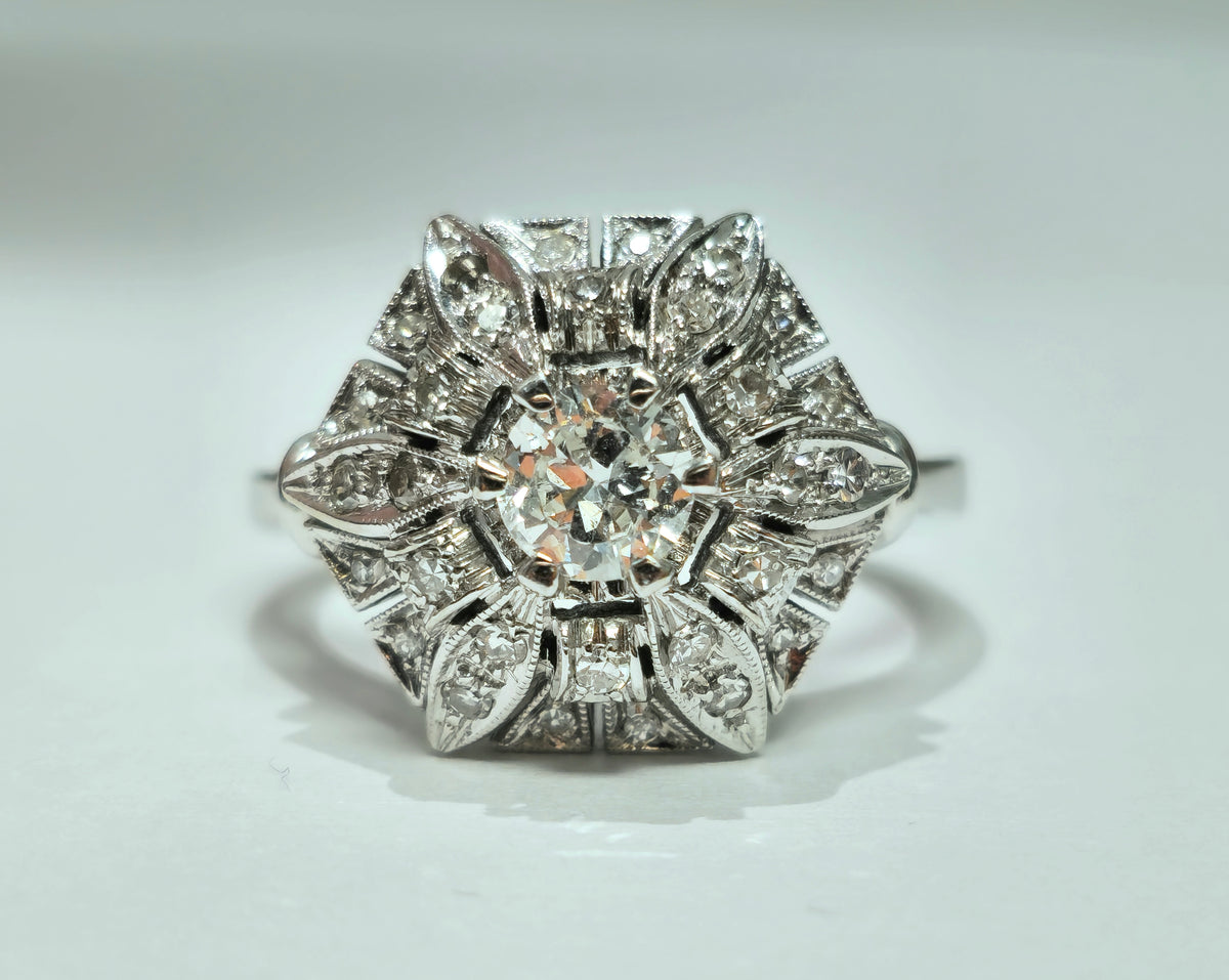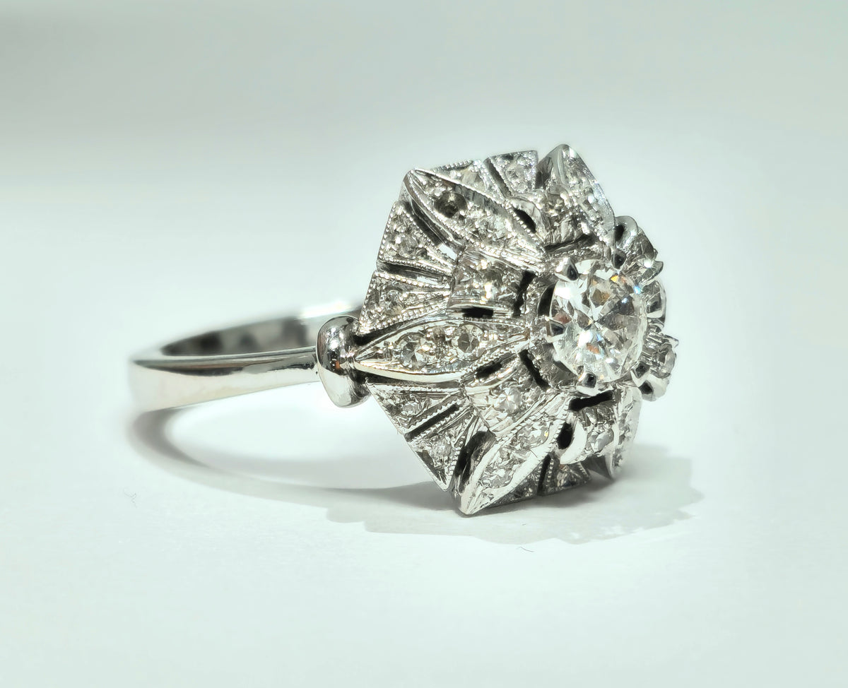 Elegant white gold decorated with clean and lustrous diamonds. Perfect feminine engagement or wedding ring. Art Deco style white gold...