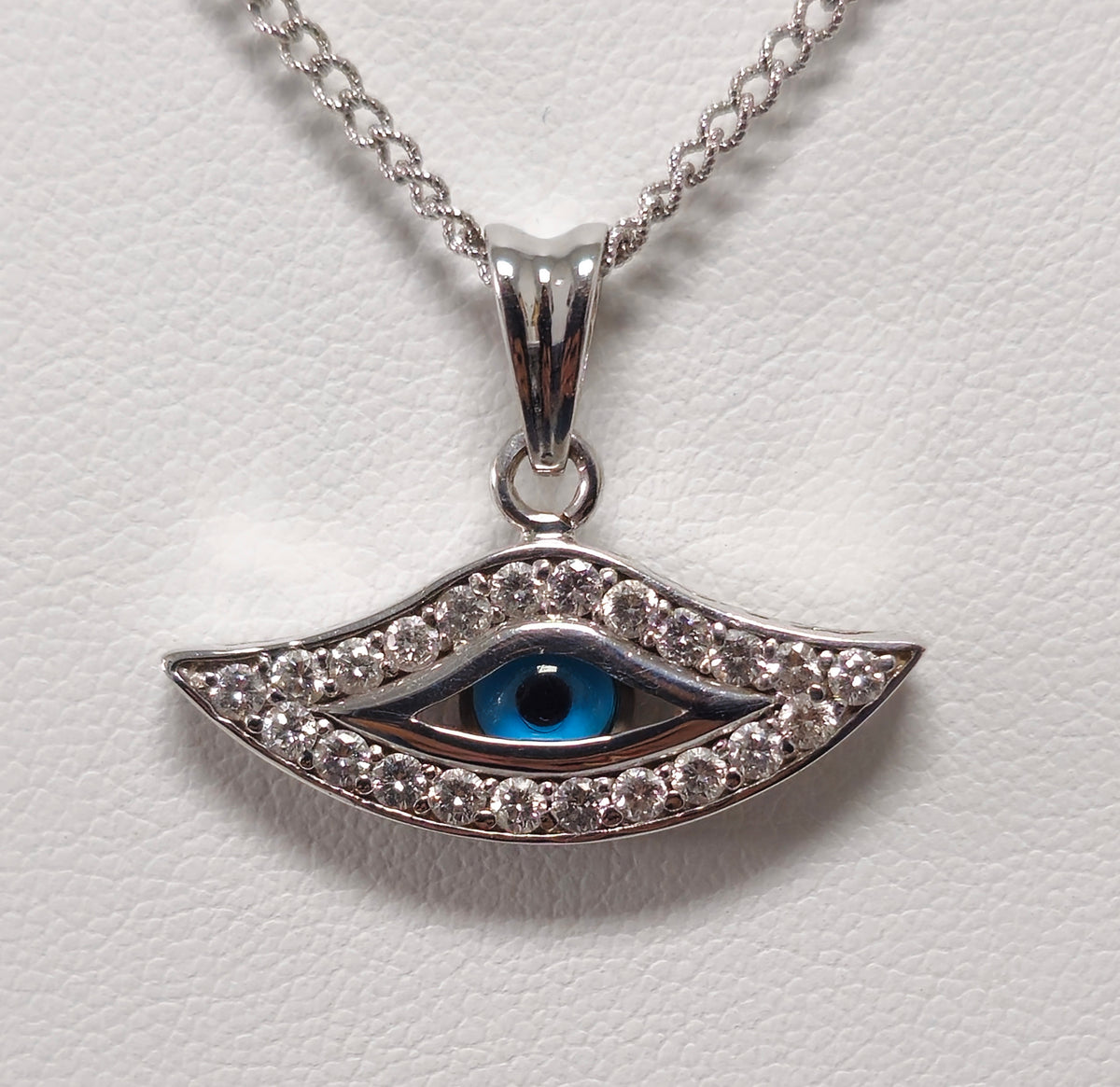 Perfect ladies fine jewelry necklace. Sublime evil eye and diamond necklace.  Chain: 14k white gold (tested). Pendant: 18K white gold (tested)....