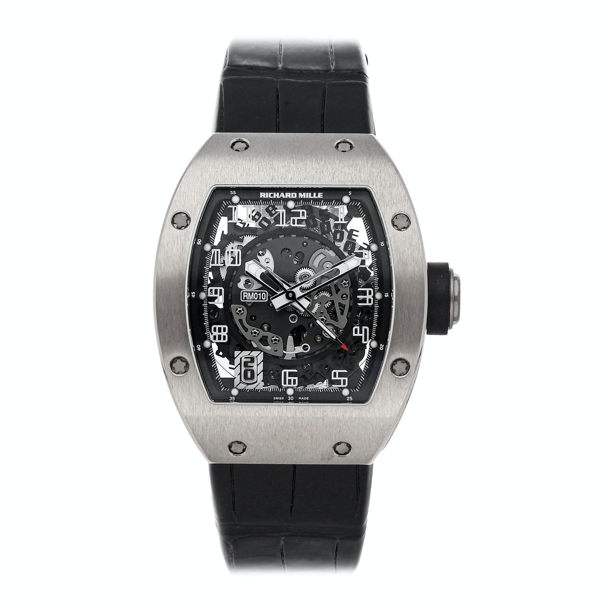 Richard Mille RM 010. Titanium case. Case size: 48x39 mm. Calibre: RMAS7. Automatic movement with date functionality. Skeletonized dial. Titanium...
